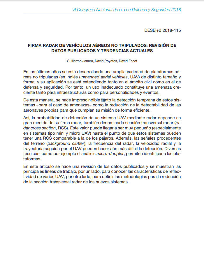 En la actualidad, Lla detección temprana de las plataformas aéreas no tripuladas y a su vez la reducción de la detectabilidad indetectabilidad de las propias es imprescindible en los ámbitos de Defensa y Seguridad para la seguridad. La probabilidad de detección de una plataforma aérea no tripulada (UAV) mediante radar depende en gran medida de su firma radar, también denominada sección transversal radar (Radar Cross Section - RCS). Este valor puede llegar a ser muy pequeño, especialmente en sistemas tipo Mini y Micro UAV, hasta el punto de que estos sistemas pueden tener una RCS comparable a la de los pájaros. Además, las señales procedentes del terreno (background clutter), la frecuencia del radar, la velocidad radial y la trayectoria seguida por el UAV pueden hacer aún más difícil la detección. Diversas técnicas, como por ejemplo el análisis micro-Doppler, permiten identificar a las plataformas. En este artículo se hace una revisión de las líneas de investigación y los datos publicados en este campo, y se esbozan muestran las principales líneas de trabajo, por un lado, para conocer las características de reflectividad de varios UAVs operativos, y por otro lado para definir las metodologías de reducción de la sección transversal radar de los nuevos sistemas.