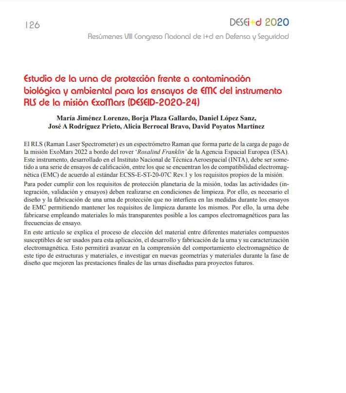 El RLS (Raman Laser Spectrometer) es un espectrómetro Raman que forma parte de la carga de pago de la misión ExoMars 2022 a bordo del rover ‘Rosalind Franklin’ de la Agencia Espacial Europea (ESA). Este instrumento, desarrollado en el Instituto Nacional de Técnica Aeroespacial (INTA), debe ser sometido a una serie de ensayos de calificación, entre los que se encuentran los de compatibilidad electromagnética (EMC) de acuerdo al estándar ECSS-E-ST-20-07C Rev.1 y los requisitos propios de la misión.